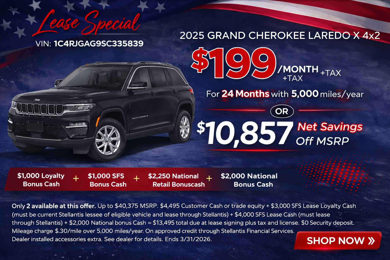 1C4RJGAG9SC355839Only 2 available at this offer. Up to $40,375 MSRP. $4,495 Customer Cash or trade equity + $3,000 SFS Lease Loyalty Cash (must be current Stellantis lessee of eligible vehicle and lease through Stellantis) + $4,000 SFS Lease Cash (must lease through Stellantis) +$2,000 National bonus Cash = $13,495 total due at lease signing plus tax and license. $0 Security deposit. Mileage charge $.30/mile over 5,000 miles/year. On approved credit through Stellantis Financial Services. Not all buyers will qualify. Dealer installed accessories extra. See dealer for details. Ends 3/31/2026.1C4RJGAG9SC355839