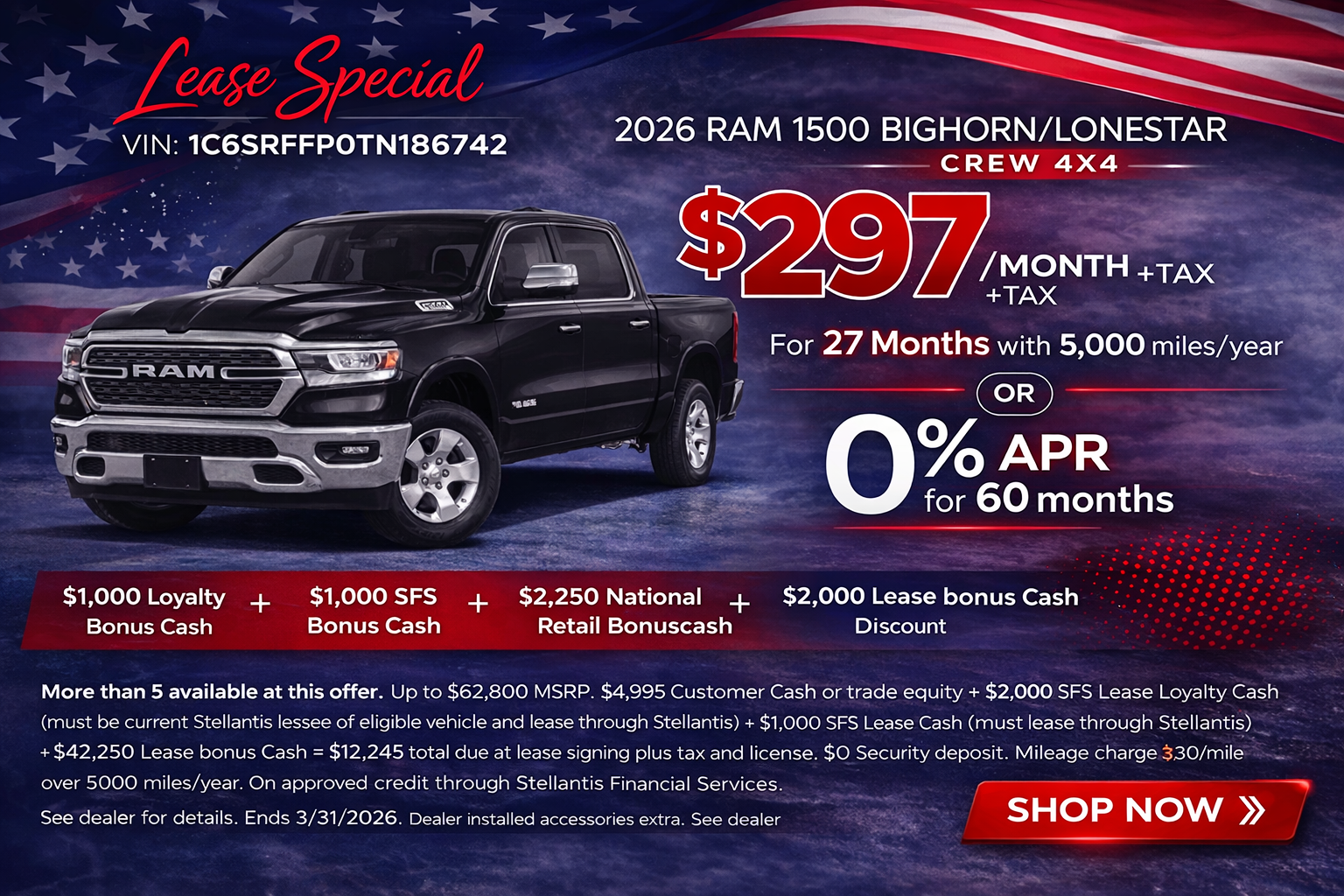 More than 5 available at this offer. Up to $62,800 MSRP. $4,995 Customer Cash or trade equity + $2,000 SFS Lease Loyalty Cash (must be current Stellantis lessee of eligible vehicle and lease through Stellantis) + $1,000 SFS Lease Cash (must lease through Stellantis) +$4,250 Lease bonus Cash = $12,245 total due at lease signing plus tax and license. $0 Security deposit. Mileage charge $.30/mile over 5,000 miles/year. On approved credit through Stellantis Financial Services. Not all buyers will qualify. Dealer installed accessories extra. See dealer for details. Ends 3/31/2026
